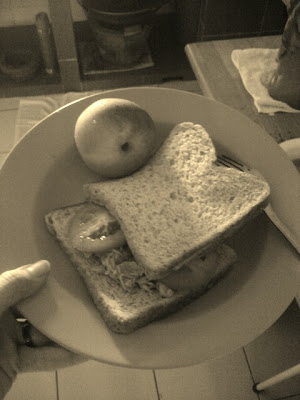 im back home and i got nothing to eat for lunch, so i went down to buy tomatoes and tuna flakes in water. no sauce or anything, my sandwich is only filled with tuna and tomatoes, thats the way i want, to be healthy 🙂